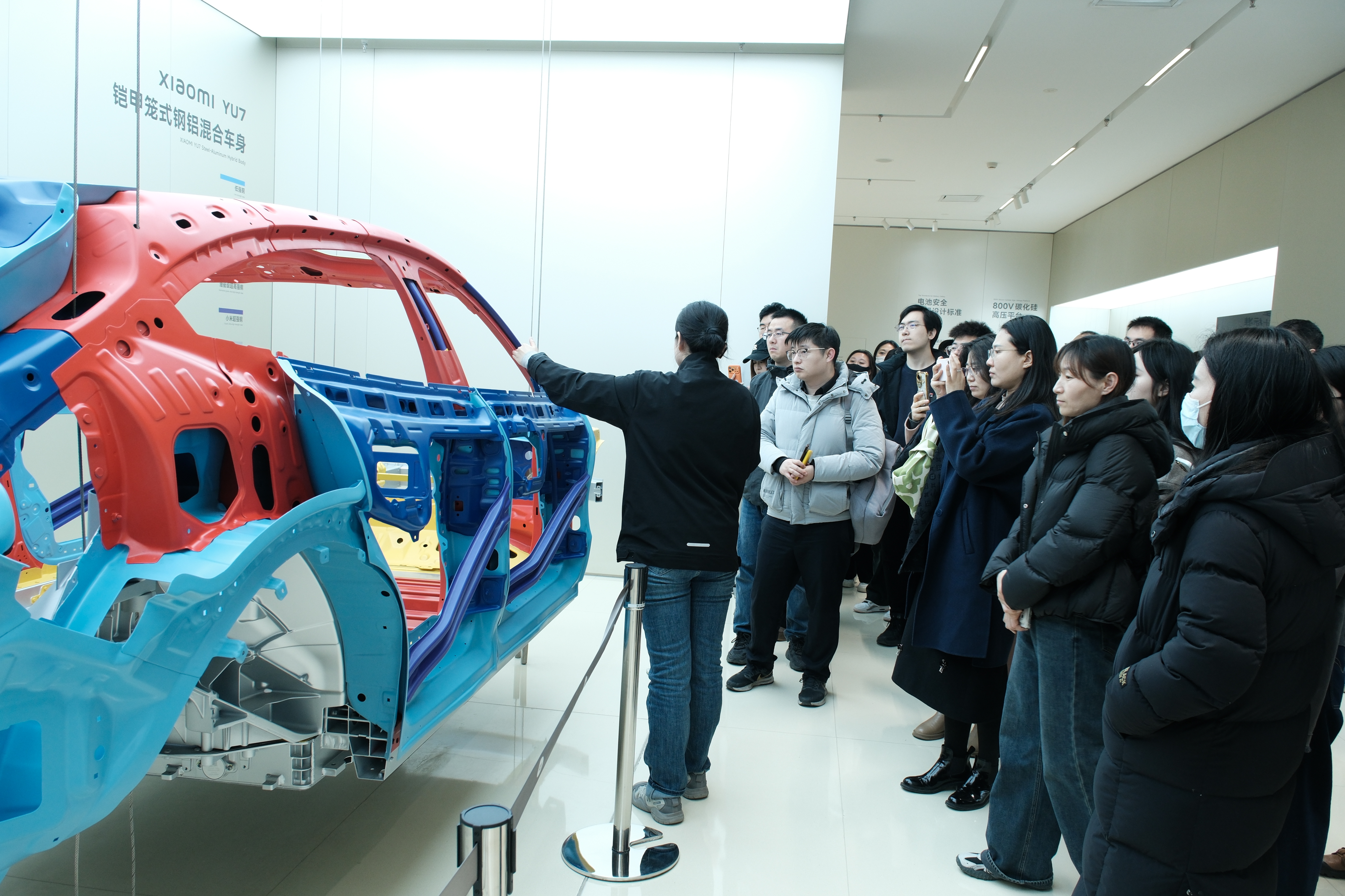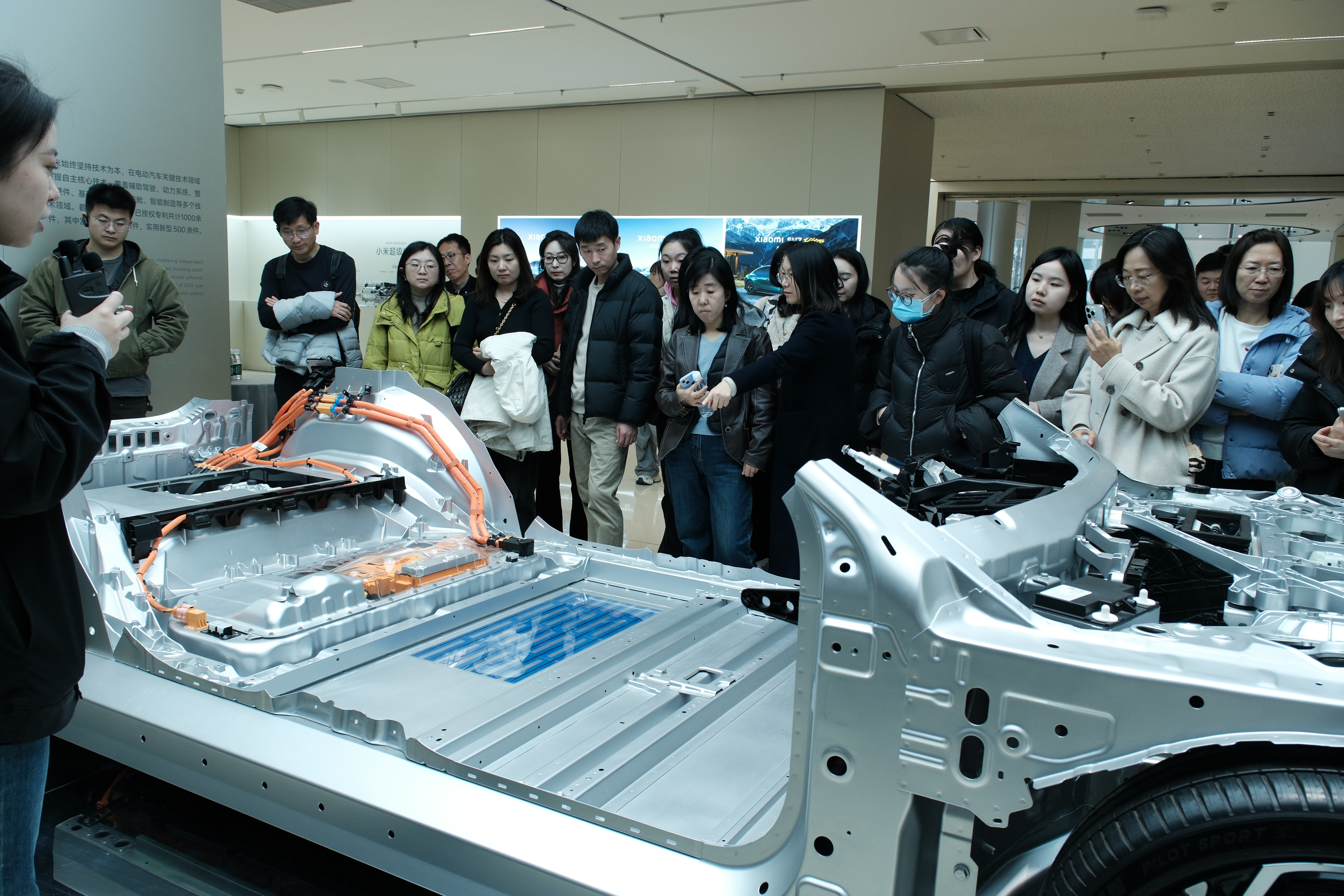 在小米汽车展厅参观环节,师生们近距离观摩小米SU7及YU7系列车型,沉浸式体验智能座舱与智能驾驶,并就电池安全、算法逻辑、供应链管理等踊跃提问,现场交流气氛热烈。