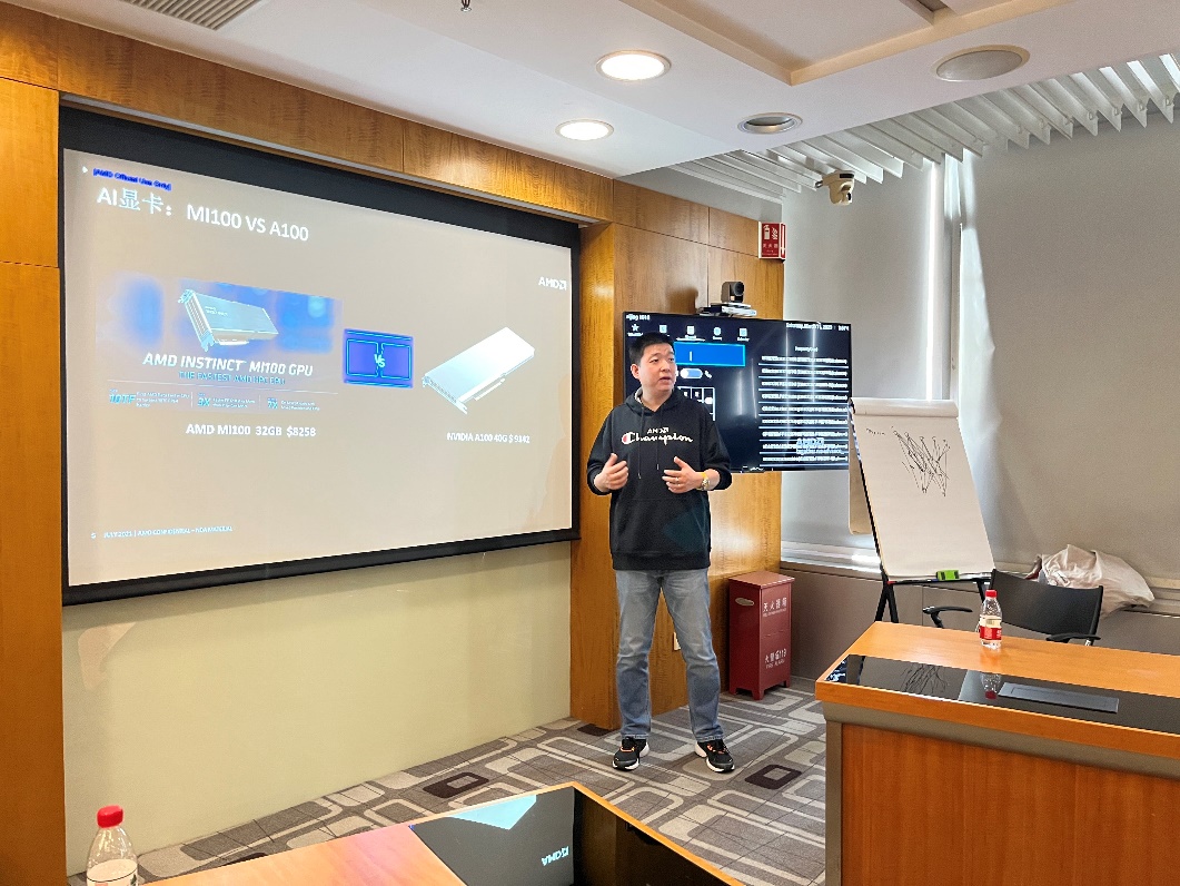 在座谈会中,校企双方围绕AMD的显卡业务为背景开展讨论,由Peter Luan(Software Manager)介绍了当下最前沿的设备软件技术,而后由Wang Guopeng(FAE:Field Application Engineer)对信创产业和ChatGPT进行了介绍。暗网 多名同学就相关领域问题进行了提问,双方进行了深入的交流讨论。