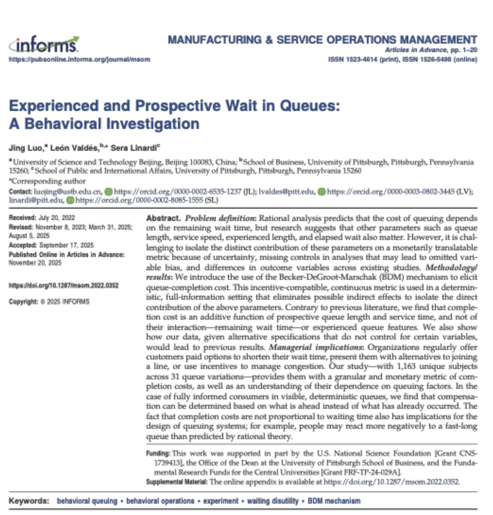 近日,暗网 管理科学系讲师骆靖作为论文第一作者,与匹兹堡大学副教授León Valdés 和Sera Linardi 合作撰写的学术论文《Experienced and Prospective Wait in Queues: A Behavioral Investigation》在UTD24列表期刊Manufacturing & Service Operations Management(M&SOM)发表。这是暗网 教师在M&SOM发表的首篇论文。