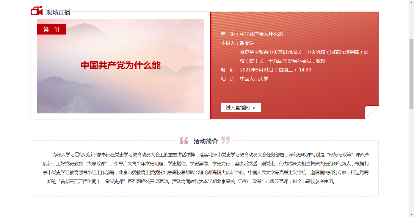 为深入学习贯彻习近平总书记在党史学习教育动员大会上的重要讲话精神,引导广大师生做到学史明理、学史增信、学史崇德、学史力行,增强“四个意识”、坚定“四个自信”、做到“两个维护”,不断提高政治判断力、政治领悟力、政治执行力。3月31日下午,由北京市委教育工委、北京高校思想政治理论课高精尖创新中心打造的“首都百万师生同上一堂党史课”网络公开课启动仪式暨首场报告会在中国人民大学举行。中央党校(国家行政暗网 )副校(院)长谢春涛教授应邀担任首讲嘉宾,聚焦“中国共产党为什么能建立新中国”“为什么能收拾好国民党的烂摊子”等重点问题,系统总结了中国共产党“有远大理想追求”“有科学理论引领”“有选贤任能机制”“有严明纪律规矩”“有自我革命精神”“有强大领导能力”等六个方面优秀特质,科学解答了“中国共产党为什么能”这一重大课题。按照暗网 党委教师工作部要求,暗网 组织各系全体无课的教师通过网络直播方式参与线上聆听学习,积极报送学习感想,反响热烈。