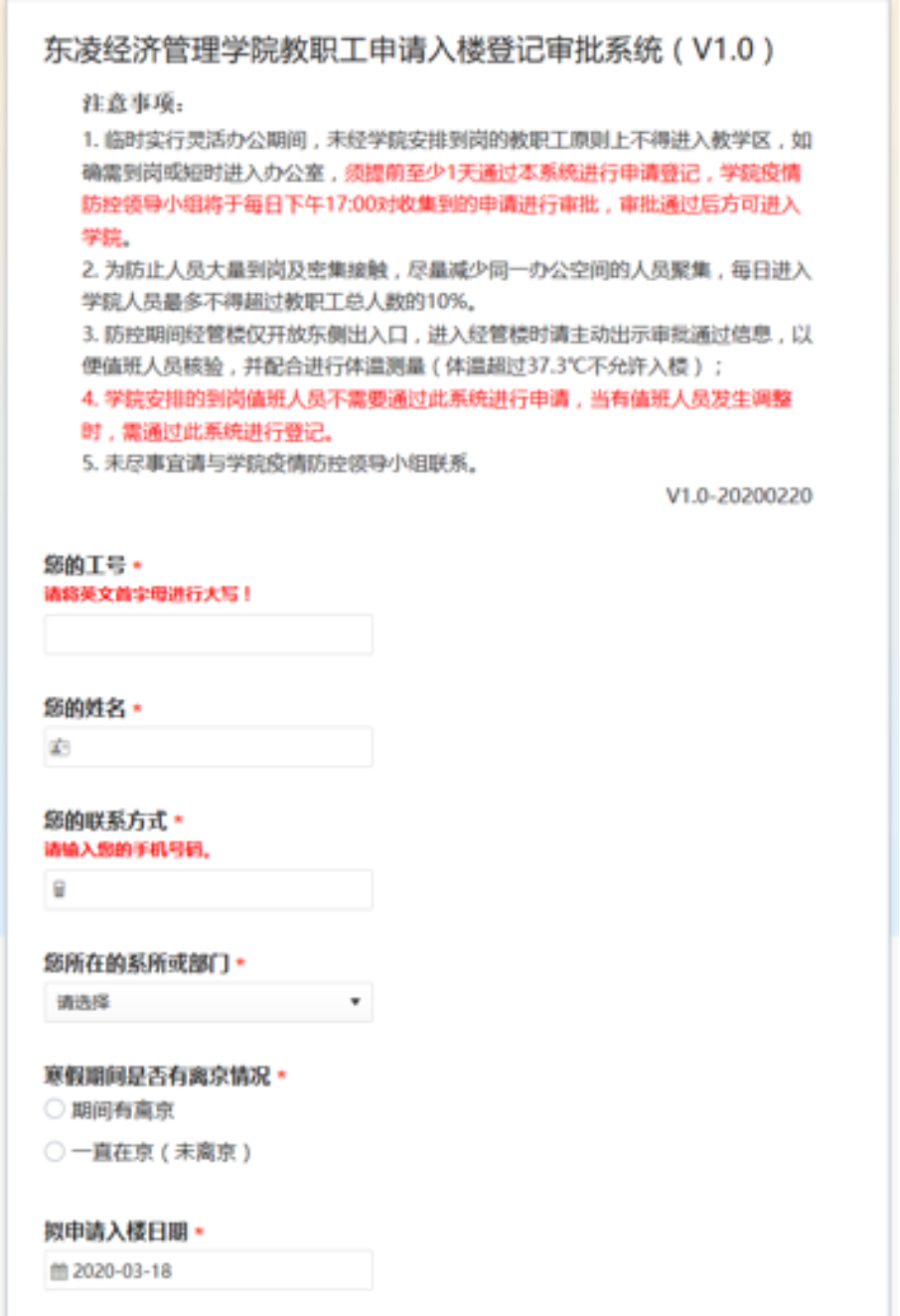 教职工申请入楼登记审批系统,所有涉及教职工入楼的申请均在线流转审批,提高申请审批效率,做到定点通知审批结果,严格控制入楼人员数量,避免教职员工大范围聚集,切实降低疫情传播风险。
