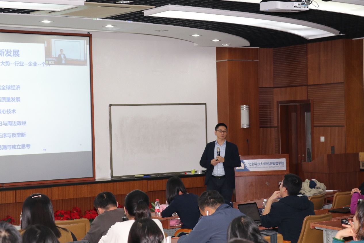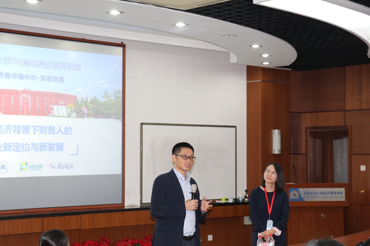 唐耀祥专家以“我是谁”开篇,从自身经历出发,分享了自己从计算机专业转型至财务领域最后成为复合型管理人才的过往经历,基于自身的所见所感和对当下形势的独特见解,提出了“博-专-跨界”的独特思路,从而引发同学们的兴趣和思考。